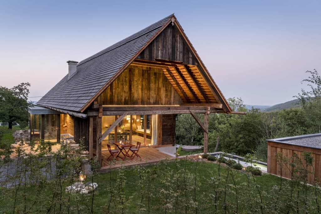 200 Jahre altes Bauernhaus. Moderner Anbau aus Holz, Glas und Naturstein. Freiheitsgefühl inmitten 55.000 m² Natur. Bis 4 Personen.